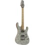 Stratocaster HH avec table flammée grise, vibrato Steel HRC57, look premium, polyvalente rock/metal, idéale pour les guitaristes recherchant puissance et élégance dans un seul instrument.