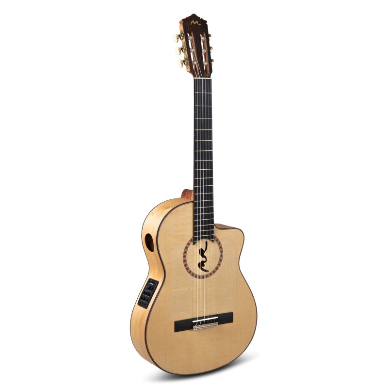 Pensée comme un pont entre tradition et innovation, la FLAMENCO FF Sabicas Cutaway rend hommage au légendaire Sabicas tout en intégrant les attentes des musiciens contemporains. Ce modèle électro-acoustique entièrement massif, doté d’un pan coupé discret, conjugue la finesse artisanale de l’atelier Manuel Rodríguez à une ergonomie parfaitement adaptée à la scène.