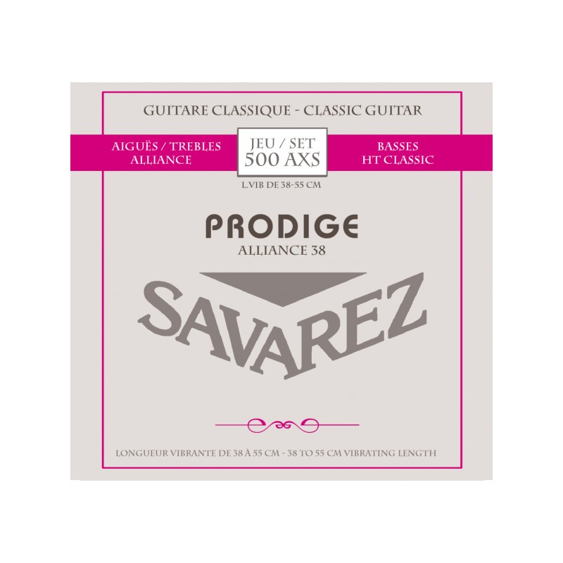 Le jeu de cordes Savarez Prodige alliance pour guitare classique est composé d'aiguës KF Alliance et de basses HT CLASSIQUES filées sur multifilament Stabilon.